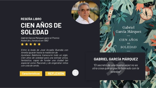 Gabriel García Márquez fue uno de los grandes novelistas del siglo XX, renovador de la literatura en español y figura clave en el auge del llamado realismo mágico. Nació el 6 de marzo de 1927, Aracataca, Colombia Está considerado uno de los principales autores del realismo mágico, y su obra más conocida, la novela Cien años de soledad. Publicó su obra más exitosa, en 1967 y se convirtió en una de las novelas más importantes de la literatura del siglo XX. En 1982 recibió el Premio Nobel de Literatura «por sus novelas e historias cortas, en las que lo fantástico y lo real se combinan en un mundo ricamente compuesto de imaginación, lo que refleja la vida y los conflictos de un continente»