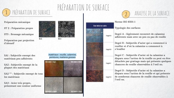 Préparation mécanique ST 2 : Préparation propre ST3 : Brossage mécanique Préparation par projection d'abrasif SA1 : Subjectile exempt des matériaux peu adhérents SA2 : Subjectile exempt de la plupart des matériaux SA2 1/2 : Subjectile exempt de tous les matériaux SA3 : Acier très propre, présentant une couleur uniforme