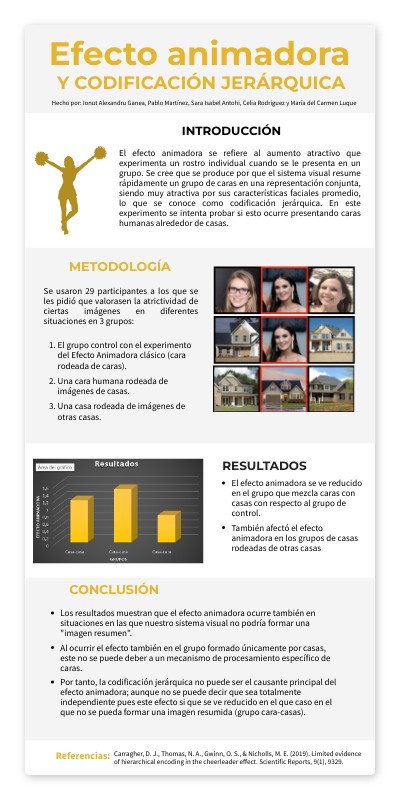 El efecto animadora se refiere al aumento atractivo que experimenta un rostro individual cuando se le presenta en un grupo. Se cree que se produce por que el sistema visual resume rápidamente un grupo de caras en una representación conjunta, siendo muy atractiva por sus características faciales promedio, lo que se conoce como codificación jerárquica. En este experimento se intenta probar si esto ocurre presentando caras humanas alrededor de casas.