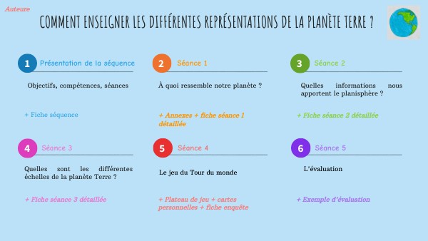 - Découvrir des outils numériques pour dessiner, communiquer, rechercher et restituer des informations simples. - Se repérer, s'orienter et se situer dans un espace géographique. - Se repérer dans son environnement proche. J'ai essayé de varier, au mieux, les modalités et les supports de chaque séance afin que la séquence soit attractive et non monotone. J'ai crée la fiche séquence et toutes les fiches séances détaillées présentes dans cette carte mentale interactive.