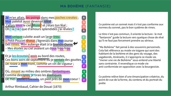 Ce poème est un sonnet mais il n'est pas conforme aux normes du sonnet, pas le bon système de rimes. Le titre n'est pas commun, il oriente la lecture : le mot "fantansie" guide la lecture vers quelque chose de rêvé qu'il ne faut pas forcement prendre au sérieux. "Ma Bohème" fait pensé à des souvenirs personnels. Cela fait référence au mode vie tsigane qui sont des habitant de la bohème et des gens du voyage, des vagabonds, itinérants, il s'approprie ce mode vie. "mener une vie de Bohème" sous-entend une liberté sans contrainte. Il revendique ce mode vie anti-conformiste en opposition avec la bourgeoisie. Ce poème relève bien d'une émancipation créatrice, du point de vue de la forme, du contenu et du portrait du poète