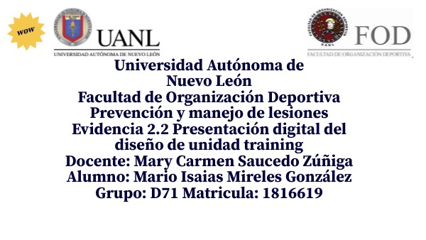 Universidad Autónoma de Nuevo León Facultad de Organización Deportiva Prevención y manejo de lesiones Evidencia 2.2 Presentación digital del diseño de unidad training Docente: Mary Carmen Saucedo Zúñiga Alumno: Mario Isaias Mireles González Grupo: D71 Matricula: 1816619