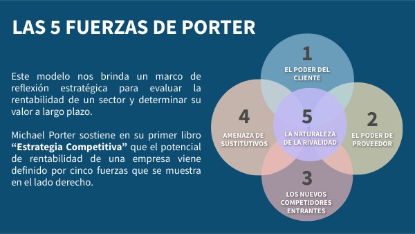 Este modelo nos brinda un marco de reflexión estratégica para evaluar la rentabilidad de un sector y determinar su valor a largo plazo. Michael Porter sostiene en su primer libro “Estrategia Competitiva” que el potencial de rentabilidad de una empresa viene definido por cinco fuerzas que se muestra en el lado derecho.