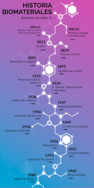 Arthur Zierold documentó la reacción de los tejidos vivos frente a materiales como aluminio, plata y oro, de los cuales determinó que, a pesar de su buena tolerancia, sus propiedades mecánicas no eran aceptables, lo cual fue el punto de partida de muchas investigaciones que tenían como fin elaborar aleaciones entre metales que combinaran buena tolerancia con características mecánicas aceptables. Posterior a las primeras síntesis de materiales poliméricos artificiales, en 1940 se pensó en estos como posibles alternativas en vez de los metales para implantes. A materiales como el nylon y el celofán se les practicaron pruebas in vitro, pero evidenciaron reacciones marcadamente fibróticas. Por su parte, materiales biocompatibles ampliamente usados como el titanio y el teflón aparecieron en el ámbito científico en 1947 y 1949 respectivamente.