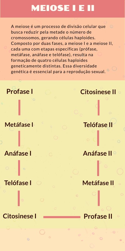 A meiose é um processo de divisão celular que busca reduzir pela metade o número de cromossomos, gerando células haploides. Composto por duas fases, a meiose I e a meiose II, cada uma com etapas específicas (prófase, metáfase, anáfase e telófase), resulta na formação de quatro células haploides geneticamente distintas. Essa diversidade genética é essencial para a reprodução sexual.