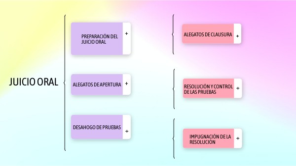 El juicio oral se desarrolla en 3 etapas: ● Etapa de apertura: Es cuando se exponen los alegatos de apertura. ● Etapa de pruebas: Es cuando se presentan las pruebas para intentar demostrar los presupuestos planteados en los alegatos de apertura. ● Etapa de clausura: Es cuando se exponen los alegatos de clausura.