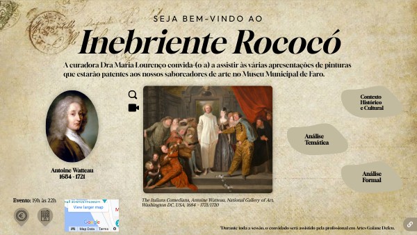 https://youtu.be/UtSTQGrvGAw?feature=shared https://artsandculture.google.com/asset/the-italian-comedians-antoine-watteau/fQHyFQRBSQLiyg https://www.nga.gov/collection/art-object-page.32687.html https://www.washingtonpost.com/arts-entertainment/interactive/2023/jean-watteau-italian-comedians/ https://pt.wikipedia.org/wiki/Ficheiro:Antoine_Watteau_-_The_Italian_Comedians_-_Google_Art_Project.jpg https://pt.wikipedia.org/wiki/Antoine_Watteau https://www.google.com/maps/place/Museu+Municipal+de+Faro/@37.0129578,-7.9338835,17z/data=!4m6!3m5!1s0xd0552c1a67fd11d:0x2ee495742e6b6708!8m2!3d37.0129578!4d-7.9338835!16s%2Fg%2F1v7tmmnd?hl=pt-BR&entry=ttu https://www.cm-faro.pt/pt/menu/1064/perguntas-frequentes.aspx#qual-o-preco-da-entrada-no-museu-e-que-descontos-praticam https://youtu.be/_myYTXlRBfE?feature=shared