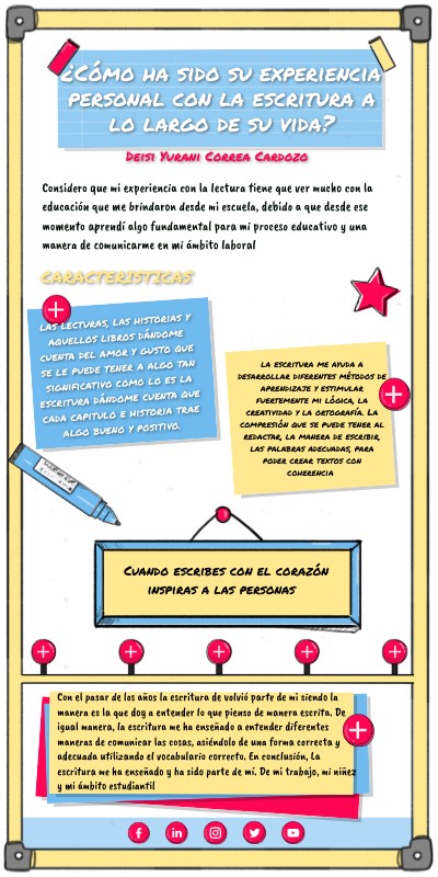 Con el pasar de los años la escritura de volvió parte de mi siendo la manera es la que doy a entender lo que pienso de manera escrita. De igual manera, la escritura me ha enseñado a entender diferentes maneras de comunicar las cosas, asiéndolo de una forma correcta y adecuada utilizando el vocabulario correcto. En conclusión, La escritura me ha enseñado y ha sido parte de mí. De mi trabajo, mi niñez y mi ámbito estudiantil