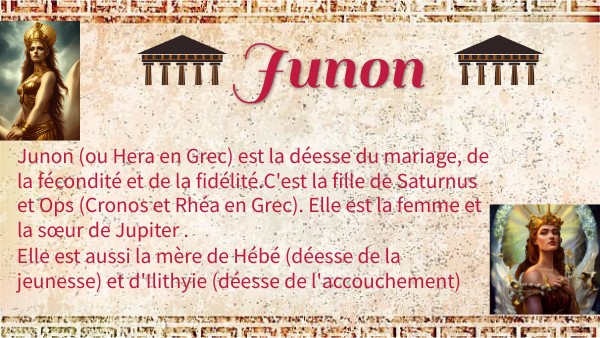 Junon (ou Hera en Grec) est la déesse du mariage, de la fécondité et de la fidélité.C'est la fille de Saturnus et Ops (Cronos et Rhéa en Grec). Elle est la femme et la sœur de Jupiter .