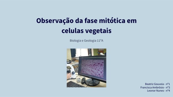 A mitose é dividida em quatro fases principais: prófase, metáfase, anáfase e telófase. Durante a prófase, os cromossomas se condensam, a membrana nuclear se desintegra e os microtúbulos do fuso se formam. Na metáfase, os cromossomas alinham-se no equador da célula. Na anáfase, os cromatídios-irmãos separam-se e são puxados para os polos opostos. A telófase é a fase final, caracterizada pela formação de duas novas membranas nucleares e a descondensação dos cromossomas.O objetivo desta tividade laboratorial é a observação dos cromossomas de células de ápices radiculares de uma cebola ao microscópio.
