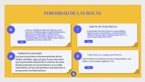 Los poros permiten el almacenamiento de los fluidos: petróleo, agua y/o gas. Es por esta razón que la porosidad representa el volumen de estos fluidos presentes en el yacimiento y es un dato importante a la hora de planificar la producción o recuperación de hidrocarburo.