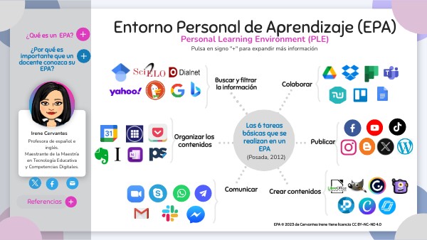 - Adell, J. y Castañeda, L. (2010). Los entornos personales de aprendizaje (PLEs): Una nueva manera de entender el aprendizaje. En R. Roig Vila y M. Fiorucci (Eds.), Claves para la investigación en innovación y calidad educativas. La integración de las tecnologías de la información y la comunicación y la interculturalidad en las aulas (pp. 19-30).Marfil. https://cent.uji.es/pub/sites/cent/files/Adell_Castaneda_2010.pdf