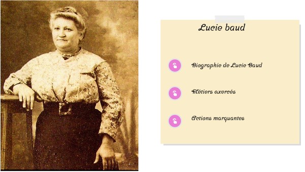 Biographie : Lucie Baud est née le 23 février 1870, à Saint Pierre de Mésage dans la région grenobloise elle issue d'une famille de paysans pauvre, elle est devenue ouvrière à l'âge de 12 ans, c'était une militante syndicaliste et féministe. Elle était mariée et avait deux enfants.