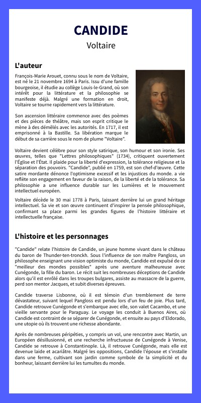 Voltaire devient célèbre pour son style satirique, son humour et son ironie. Ses œuvres, telles que "Lettres philosophiques" (1734), critiquent ouvertement l'Église et l'État. Il plaide pour la liberté d'expression, la tolérance religieuse et la séparation des pouvoirs. "Candide", publié en 1759, est son chef-d'œuvre. Cette satire mordante dénonce l'optimisme excessif et les injustices du monde. a vie reflète son engagement en faveur de la raison, de la liberté et de la tolérance. Sa philosophie a une influence durable sur les Lumières et le mouvement intellectuel européen.