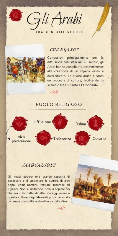 - Matematica: Gli Arabi hanno introdotto numerose innovazioni nelle scienze e nella matematica, ad esempio l'introduzione del sistema numerico indo-arabo e il contributo significativo all'algebra.