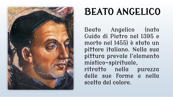Beato Angelico (nato Guido di Pietro nel 1395 e morto nel 1455) è stato un pittore italiano. Nella sua pittura prevale l'elemento mistico-spirituale, ritratto nella purezza delle sue forme e nella scelta del colore.