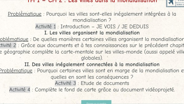 Problématique : Pourquoi les villes sont-elles inégalement intégrées à la mondialisation ? Activité 1 : Introduction – JE VOIS / JE DEDUIS I. Les villes organisent la mondialisation Problématique : De quelles manières certaines villes organisent la mondialisation ? Activité 2 : Grâce aux documents et à tes connaissances sur le précédent chapitre de géographie complète la carte-mentale sur les villes-monde (aussi appelé villes globales). II. Des villes inégalement connectées à la mondialisation Problématique : Pourquoi certaines villes sont en marge de la mondialisation et quelles en sont les conséquences ? Activité 3 : Etude de documents Activité 4 : Complète le fond de carte grâce au document vidéoprojeté.