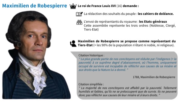 Le roi de France Louis XVI (16) demande :La rédaction des souhaits du peuple : les cahiers de doléance.L'envoi de représentants du royaume : les Etats-générauxCette assemblée représente les trois ordres (Noblesse, Clergé, Tiers-Etat)Maximilien de Robespierre se propose comme représentant du Tiers-Etat (= les 90% de la population n'étant ni noble, ni religieux).