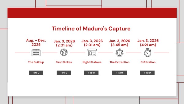 In Miraflores Palace the American forces, named Delta Force, breached the palace and captured Maduro and his wife, Cilia Flores and secured them in less than 30 minutes.