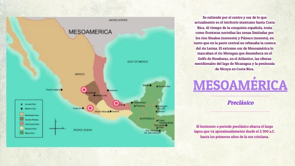 Mapa de mesoamérica en los horizontes históricos de preclásico, clásico y posclásico. En cada mapa se muestran tres culturas importantes de cada horisonte con un pequeño resumen de cada cultura.
