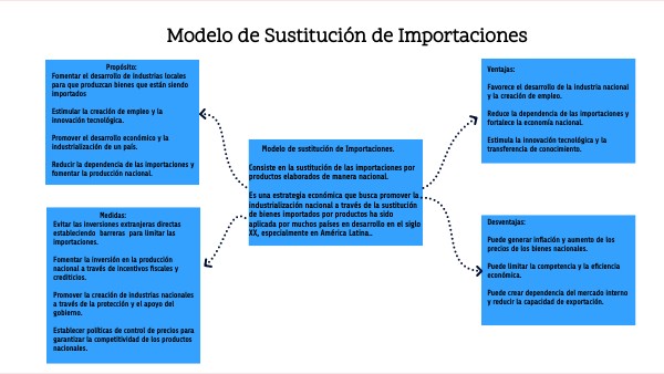 Modelo de sustitución de Importaciones. Consiste en la sustitución de las importaciones por productos elaborados de manera nacional. Es una estrategia económica que busca promover la industrialización nacional a través de la sustitución de bienes importados por productos ha sido aplicada por muchos países en desarrollo en el siglo XX, especialmente en América Latina..