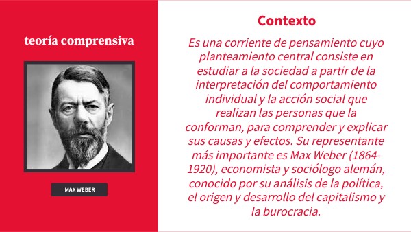 Es una corriente de pensamiento cuyo planteamiento central consiste en estudiar a la sociedad a partir de la interpretación del comportamiento individual y la acción social que realizan las personas que la conforman, para comprender y explicar sus causas y efectos. Su representante más importante es Max Weber (1864-1920), economista y sociólogo alemán, conocido por su análisis de la política, el origen y desarrollo del capitalismo y la burocracia.