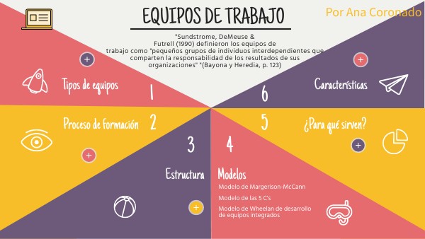 "Sundstrome, DeMeuse & Futrell (1990) definieron los equipos de trabajo como "pequeños grupos de individuos interdependientes que comparten la responsabilidad de los resultados de sus organizaciones" "(Bayona y Heredia, p. 123)
