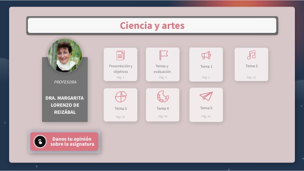 PRESENTACIÓNEn esta asignatura de Ciencia y artes vamos a acercarnos a algunos de los elementos relacionales más relevantes entre el mundo del Arte y de las manifestaciones artísticas y el mundo de la Ciencia. El recorrido de la asignatura está estructurado en 5 temas o bloques de contenidos. Se ha previsto una dedicación total a cada tema de aproximadamente 2 horas, incluyendo lecturas, visualizaciones de vídeos y tareas.El primer bloque temático se ocupa de la Música como arte sonoro y en él vamos a focalizar nuestra atención y reflexionar sobre la relación existente entre la música y la ciencia. También nos acercaremos a una concepción de la música más filosófica y cosmogónica que explica la importancia que se le ha dado a este arte desde la Antigüedad Clásica fundamentalmente como metáfora de la armonía del universo propiciando que formara parte de las disciplinas básicas en la formación de los individuos (Trivium y Quadrivium). Los contenidos del tema se distribuyen en una lección teórica introductoria con diversos apartados de interés general y material complementario para la reflexión y profundización en el tópico tratado.