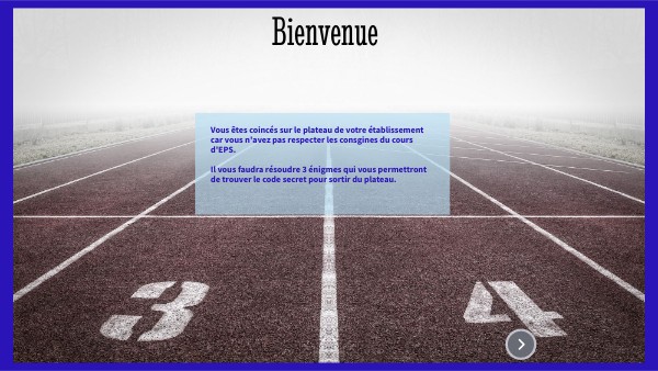 Vous êtes coincés sur le plateau de votre établissement car vous n'avez pas respecter les consgines du cours d'EPS. Il vous faudra résoudre 3 énigmes qui vous permettront de trouver le code secret pour sortir du plateau.