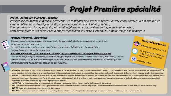 Projet : Animation d'images , dualités Réalisez une production numérique permettant de confronter deux images animées, (ou une image animée/ une image fixe) de natures différentes ou identiques (vidéo, stop motion, dessin animé, photographie...). Vous questionnerez les supports de présentation (plusieurs écrans, projections/ supports traditionnels...) Vous interrogerez le lien entre les deux images (opposition, interaction, continuité, rupture, image dans l'image...)