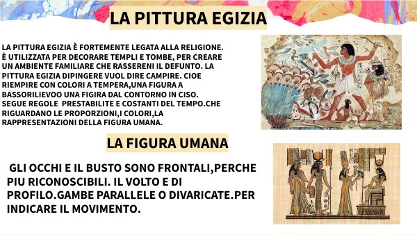 LA pittura egizia è fortemente legata alla religione. è utilizzata per decorare templi e tombe, per creare un ambiente familiare che rassereni il defunto. la pittura egizia dipingere vuol dire campire. cioe riempire con colori a tempera,una figura a bassorilievoo una figira dal contorno in ciso.segue regole prestabilite e costanti del tempo.che riguardano le proporzioni,i colori,la rappresentazioni della figura umana.