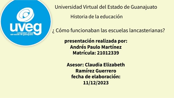 Referencias: La escuela Lancasteriana en México y en América Latina como solución del estado liberal ante el vacío dejado por la Iglesia. (2015). Universidad Pontificia de México. adio aula virtual ¿ Cómo funcionaban las escuelas lancasterianas? (s. f.) Barriendos Rodríguez,A. L./Aguilar Navarrete,P. Universidad Virtual del Estado de Guanajuato, UVEG Relatos del México antiguo. (2016). editorial Raices. https://www.google.com/url?sa=i&url=https%3A%2F%2Frelatosehistorias.mx%2Fnuestras-historias%2Fcomo-era-la-educacion-publica-en-el-mexico-independiente&psig=AOvVaw0AUFNOmz0gJJ7_1D8EFKtT&ust=1702438133089000&source=images&cd=vfe&opi=89978449&ved=2ahUKEwiSwNWy-oiDAxU3GtAFHfyAAS8Qr4kDegQIARBx imágenes tomadas de wikipedia