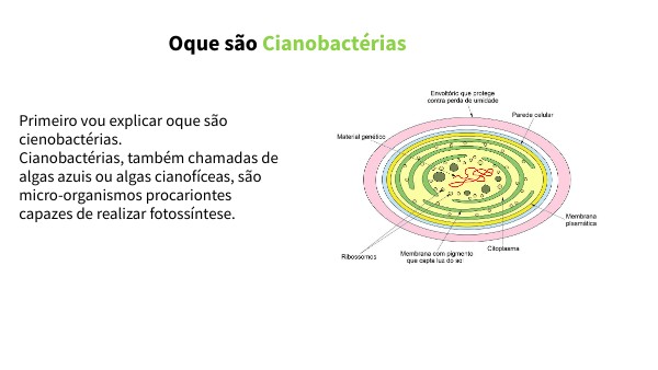 Primeiro vou explicar oque são cienobactérias. Cianobactérias, também chamadas de algas azuis ou algas cianofíceas, são micro-organismos procariontes capazes de realizar fotossíntese.