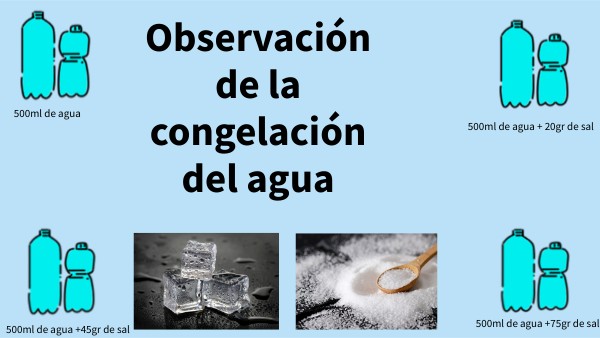 Conclusión: El agua con menos sal se congela antes que la que tiene más cantidad. La sal prolonga el tiempo de congelación.