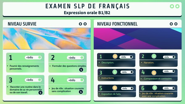 Poser des questions ou demander des informations à propos d’un sujet réel ou imaginaire (ex. vacances, famille, voyage, maison, travail, ….). Exemple 1 : Un membre du jury vous dit qu’il est parti en vacances en France et il vous demande de lui poser des questions sur son séjour (où, avec qui, quelles activités, etc.). Exemple 2 : Un membre du jury vous dit qu’il est votre nouveau voisin et vous devez lui poser des questions pour mieux le connaître