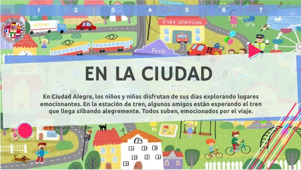 En Ciudad Alegre, los niños y niñas disfrutan de sus días explorando lugares emocionantes. En la estación de tren, algunos amigos están esperando el tren que llega silbando alegremente. Todos suben, emocionados por el viaje.