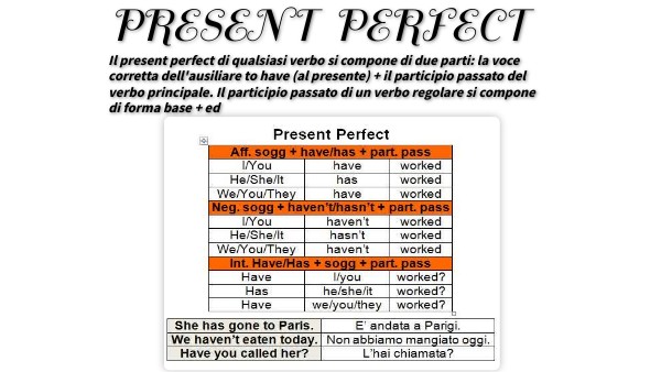 Il present perfect di qualsiasi verbo si compone di due parti: la voce corretta dell'ausiliare to have (al presente) + il participio passato del verbo principale. Il participio passato di un verbo regolare si compone di forma base + ed