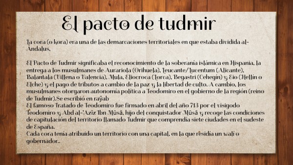 La cora (o kora) era una de las demarcaciones territoriales en que estaba dividida al-Ándalus, El Pacto de Tudmir significaba el reconocimiento de la soberanía islámica en Hispania, la entrega a los musulmanes de Aurariola (Orihuela), Leucante/Lucentum (Alicante), Balantala (Villena o Valencia), Mula, Eliocroca (Lorca), Begastri (Cehegín) y Eio (Hellín o Elche) y el pago de tributos a cambio de la paz y la libertad de culto. A cambio, los musulmanes otorgaron autonomía política a Teodomiro en el gobierno de la región (reino de Tudmir).Se escribió en raŷab El famoso Tratado de Teodomiro fue firmado en abril del año 713 por el visigodo Teodomiro y Abd al-'Azīz Ibn Mūsā, hijo del conquistador Mūsā y recoge las condiciones de capitulación del territorio llamado Tudmir que comprendía siete ciudades en el sudeste de España. Cada cora tenía atribuido un territorio con una capital, en la que residía un walí o gobernador..
