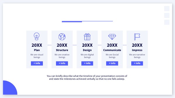 You can briefly describe what the timeline of your presentation consists of and state the milestones achieved verbally so that no one falls asleep.