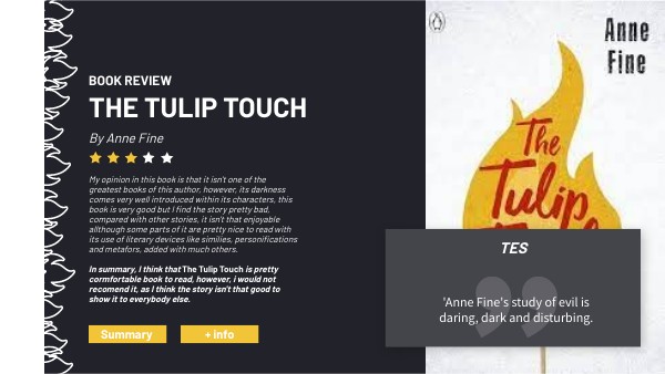My opinion in this book is that it isn't one of the greatest books of this author, however, its darkness comes very well introduced within its characters, this book is very good but I find the story pretty bad, compared with other stories, it isn't that enjoyable allthough some parts of it are pretty nice to read with its use of literary devices like similies, personifications and metafors, added with much others. In summary, I think that The Tulip Touch is pretty cormfortable book to read, however, i would not recomend it, as I think the story isn't that good to show it to everybody else.