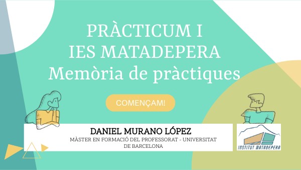 En aquesta presentació hem explicat els aprenentatges sobre el sistema educatiu, la comunitat educativa, el docent i l'alumnat que hem obtingut després de les primeres tres setmanes de pràctiques. Un institut no és només el lloc en què els adolescents aprenen uns conceptes i unes matèries: és lloc de socialització, d'intercanvi, d'aprenentatge, de relació i de descobriment. L'Institut Matadepera ha estat una opció fantàstica per veurel'aplicació de les noves propostes educatives, on l'alumne és el protagonista de l'educació. ETot i tenir un claustre molt nombrós, he coincidit amb un equip de docents de 2n ESO fix. És un equip format, predisposat i transparent, que m'ha permès accedir a tot allò que vaig demanar i veure diferents maneres de treballar, de fer classe i de relacionar-se amb els alumnes. De totes aquestes maneres se'n poden treure reflexions. En aquest sentit, cal agrair la predisposició de tot el professorat i PAS i, en especial, de la meva mentora.