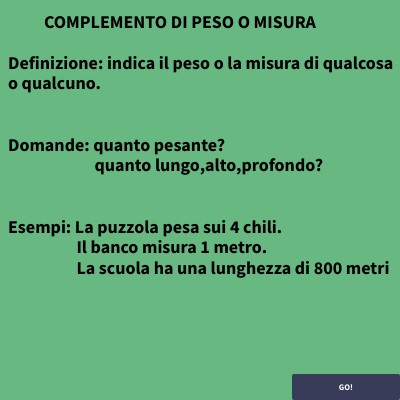 COMPLEMENTO DI PESO O MISURA Definizione: indica il peso o la misura di qualcosa o qualcuno. Domande: quanto pesante? quanto lungo,alto,profondo? Esempi: La puzzola pesa sui 4 chili. Il banco misura 1 metro. La scuola ha una lunghezza di 800 metri