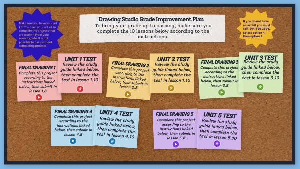 Make sure you have your art kit! You need your art kit to complete the projects that are worth 45% of your overall grade. It is not possible to pass without completing projects
