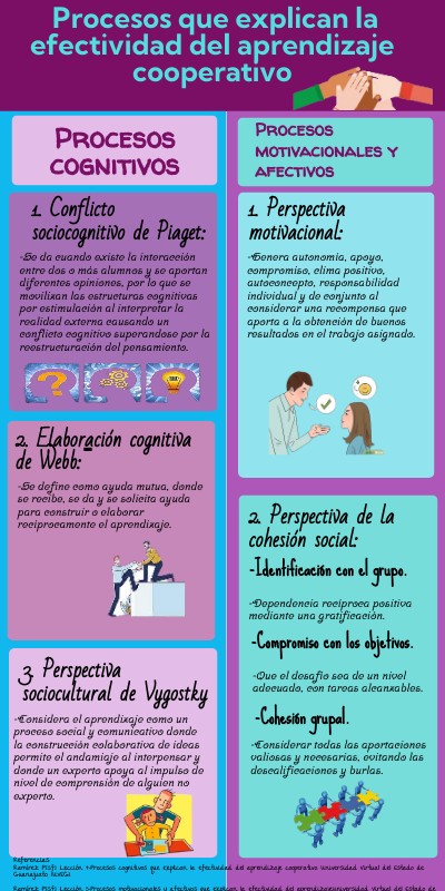 Referencias: Ramírez P.(s.f). Lección 4-Procesos cognitivos que explican la efectividad del aprendizaje cooperativo. Universidad Virtual del Estado de Guanajuato. (UVEG). Ramírez P.(s.f). Lección 5-Procesos motivacionales y afectivos que explican la efectividad del aprendizaje.Universidad Virtual del Estado de Guanajuato. (UVEG).