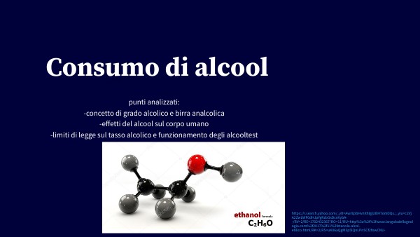 punti analizzati: -concetto di grado alcolico e birra analcolica -effetti del alcool sul corpo umano -limiti di legge sul tasso alcolico e funzionamento degli alcooltest