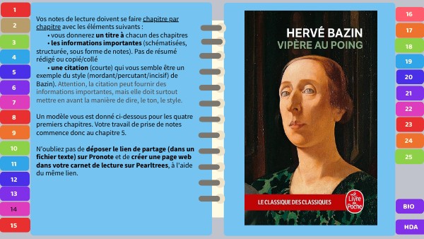 Vos notes de lecture doivent se faire chapitre par chapitre avec les éléments suivants : • vous donnerez un titre à chacun des chapitres • les informations importantes (schématisées, structurée, sous forme de notes). Pas de résumé rédigé ou copié/collé • une citation (courte) qui vous semble être un exemple du style (mordant/percutant/incisif) de Bazin). Attention, la citation peut fournir des informations importantes, mais elle doit surtout mettre en avant la manière de dire, le ton, le style. Un modèle vous est donné ci-dessous pour les quatre premiers chapitres. Votre travail de prise de notes commence donc au chapitre 5. N'oubliez pas de déposer le lien de partage (dans un fichier texte) sur Pronote et de créer une page web dans votre carnet de lecture sur Pearltrees, à l'aide du même lien.