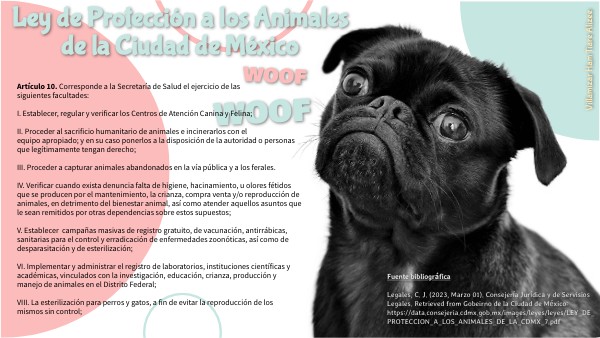 Fuente bibliográfica Legales, C. J. (2023, Marzo 01). Consejería Jurídica y de Servisios Legales. Retrieved from Gobeirno de la Ciudad de México: https://data.consejeria.cdmx.gob.mx/images/leyes/leyes/LEY_DE_PROTECCION_A_LOS_ANIMALES_DE_LA_CDMX_7.pdf
