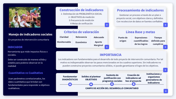 Los indicadores son fundamentales para el desarrollo de todo proyecto de intervención comunitaria. Por tal motivo es indispensable observar los pasos mencionados en los cuadros superiores. Sin indicadores no pueden construirse proyectos comunitarios sólidos, ni puede garantizarse el logro de los objetivos.