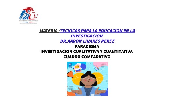 MATERIA :TECNICAS PARA LA EDUCACION EN LA INVESTIGACION DR.AARON LINARES PEREZparadigma investigacion cualitativa y cuantitativa cuadro comparativo