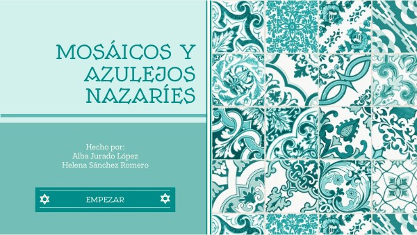 Un mosaico es un tipo de composición artística hecha con losetas o azulejos en la que se reproduce una figura o un paisaje. Cuando los azulejos forman simetrías, rotaciones y desplazamientos, nos encontramos ante un mosaico geométrico. Los mosaicos nazaríes forman parte de un arte tradicional y muy antiguo basado en las matemáticas. En su composición se utilizan trazos mixtilíneos (líneas curvas y rectas) que se entrecruzan para formar cintas, rombos, figuras geométricas, meandros, dibujos en zigzag, estrellas o ajedrezados, entre otros motivos.